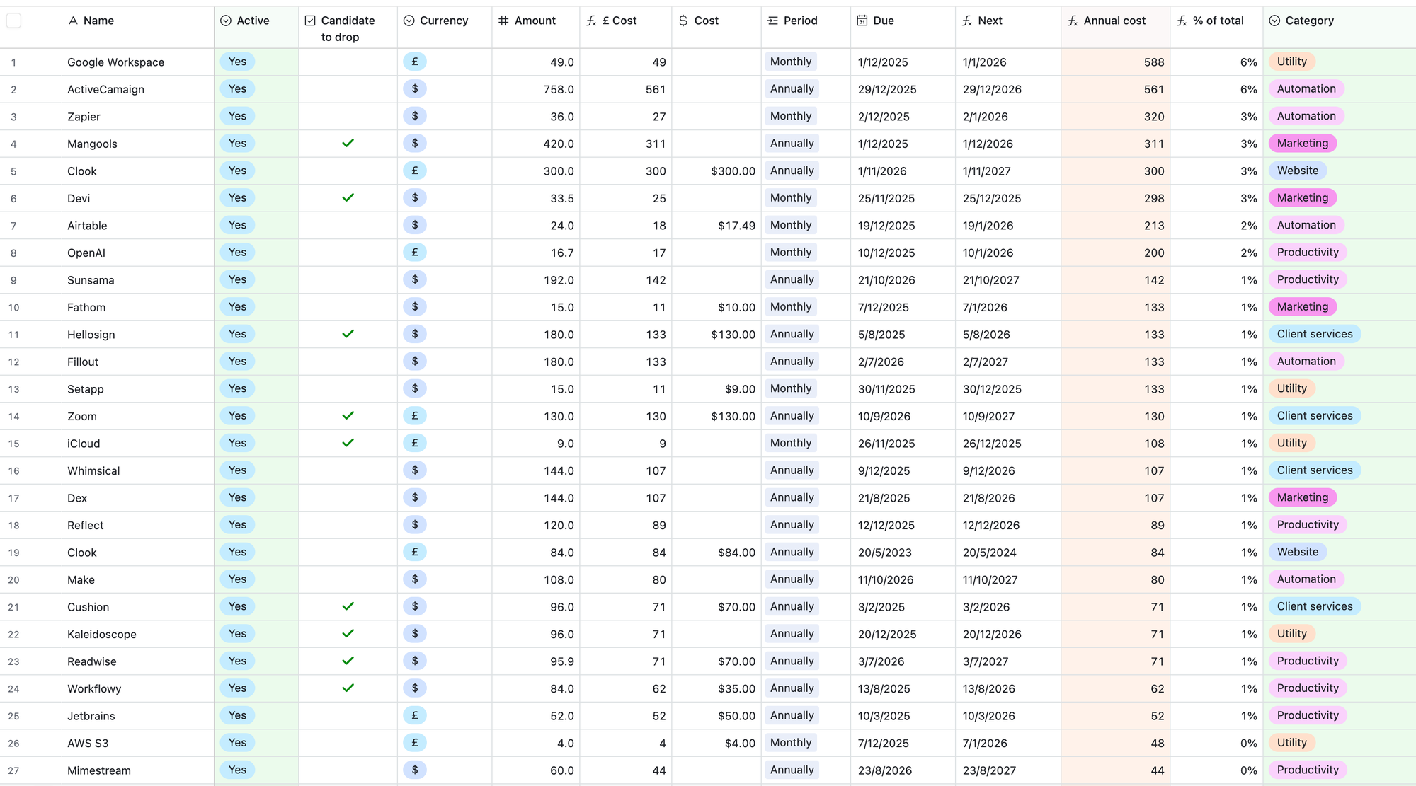 I’ve set up a simple Airtable base to manage all of my ongoing subscriptions. I’m going to write an article on this specially, but there is a snapshot of what it looks like.
