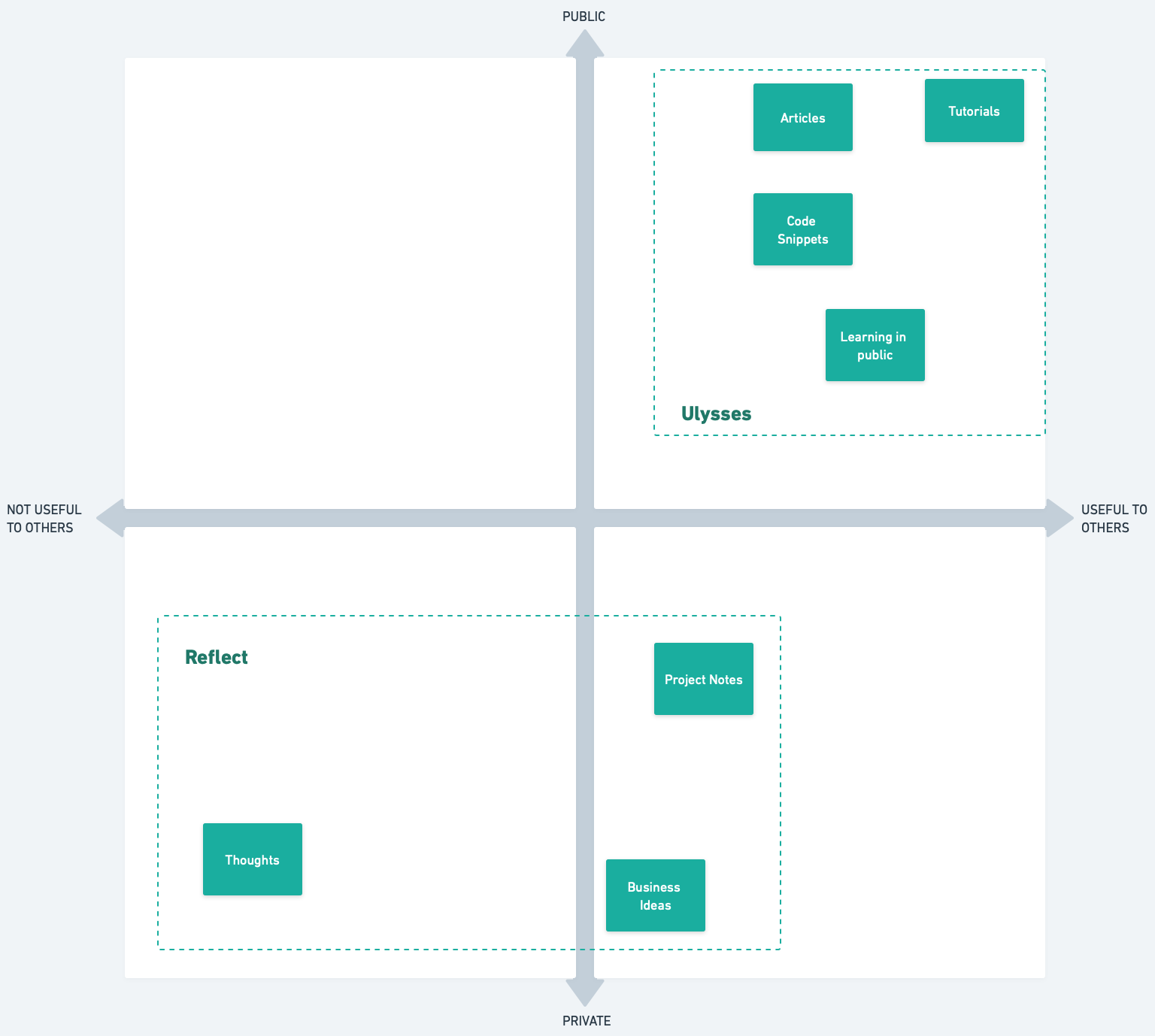Reflect is my private log. I log projects I’m working on, ideas, thoughts and anything else. Some of these turn into notes and if I decide the note could be made public, I’ll move it to Ulysses.
