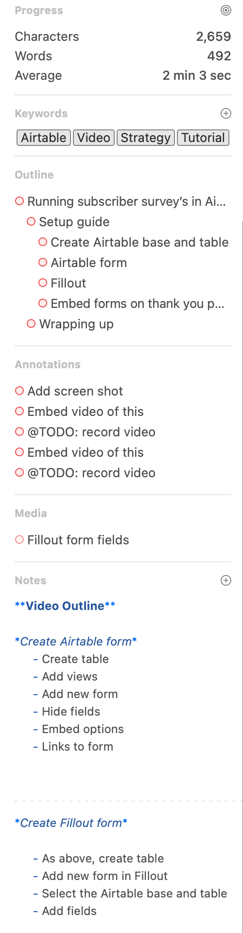 I love that fact that all of this is in the dashboard next to the content itself. I don’t need to keep it in a different place like a notes apps. It means all my content production is in Ulysses and nicely organised.