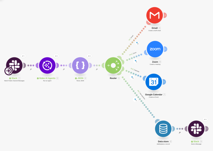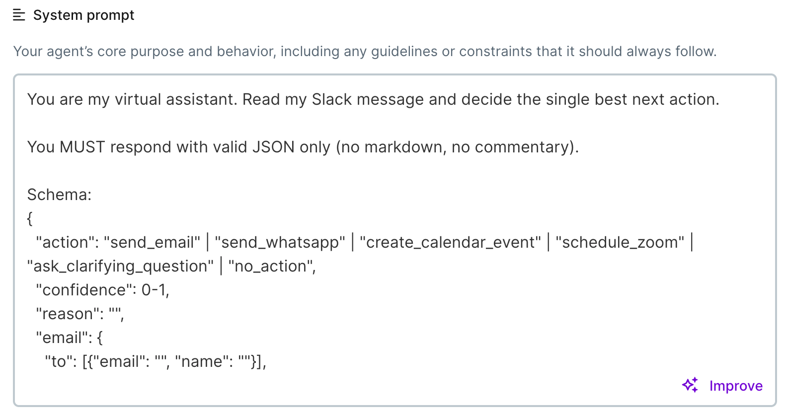 The agent has the main prompt, along with context, tools and MCP. I’ve asked it to use JSON for its response so that it can explicitly say that the action (such as, send email, schedule Zoom meeting) should be. This is then used in the Make scenario to perform the action itself.