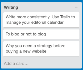 For each article you want to write, create a new card. You can think of a card as a sticky note that you stick on the fridge or on your computer monitor to remind you to do something. A card belongs to one of the above stages, which in Trello language is a list. You can then move your card between each of the stages by dragging it to the next list.